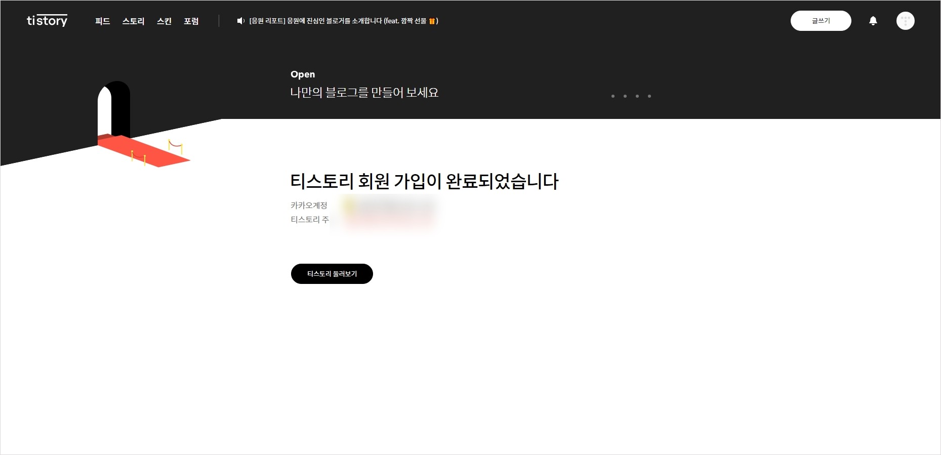 스킨 적용을 하신다면 사진5와 같이 티스토리 회원가입과 블로그를 개설하실 수 있을 것입니다. 자 이제 모든 준비는 끝났습니다. 다음에는 설정 방법과 그 외 여러분들이 필요한 정보에 대해서 가져오겠습니다. 저와 같은 생각을 가지시거나 저처럼 막 시작하신분들 소통할 수 있는 카톡방 하나 만드는 것이 목표가 되었습니다.